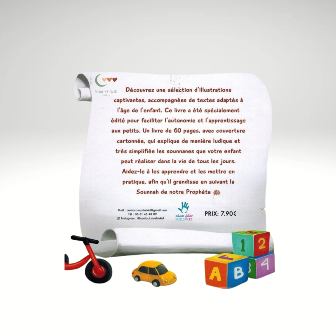 Découvrez une sélection d'illustrations captivantes, accompagnées de textes adaptés à l'âge de l'enfant. Ce livre a été spécialement édité pour faciliter l'autonomie et l'apprentissage aux petits. Un livre de 60 pages, avec couverture cartonnée, qui explique de manière ludique et très simplifiée les Sounnanes que votre enfant peut réaliser dans la vie de tous les jours. Aidez-le à les apprendre et les mettre en pratique, afin qu'il grandisse en suivant la Sounnah de notre Prophète.